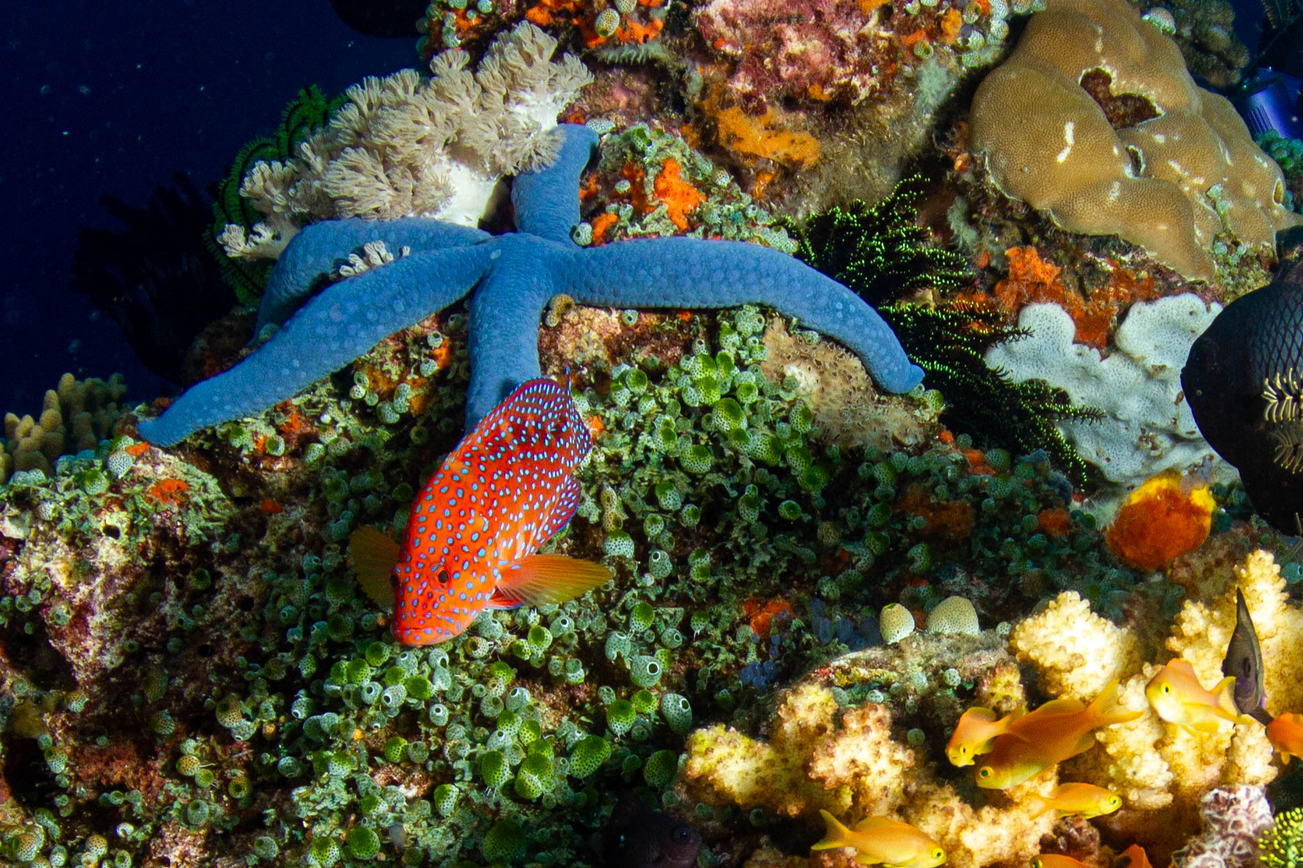 Russ with beautiful coral, followed by Anemone Fish, followed by a Yellow Featherstar (aka Crinoid). Below: