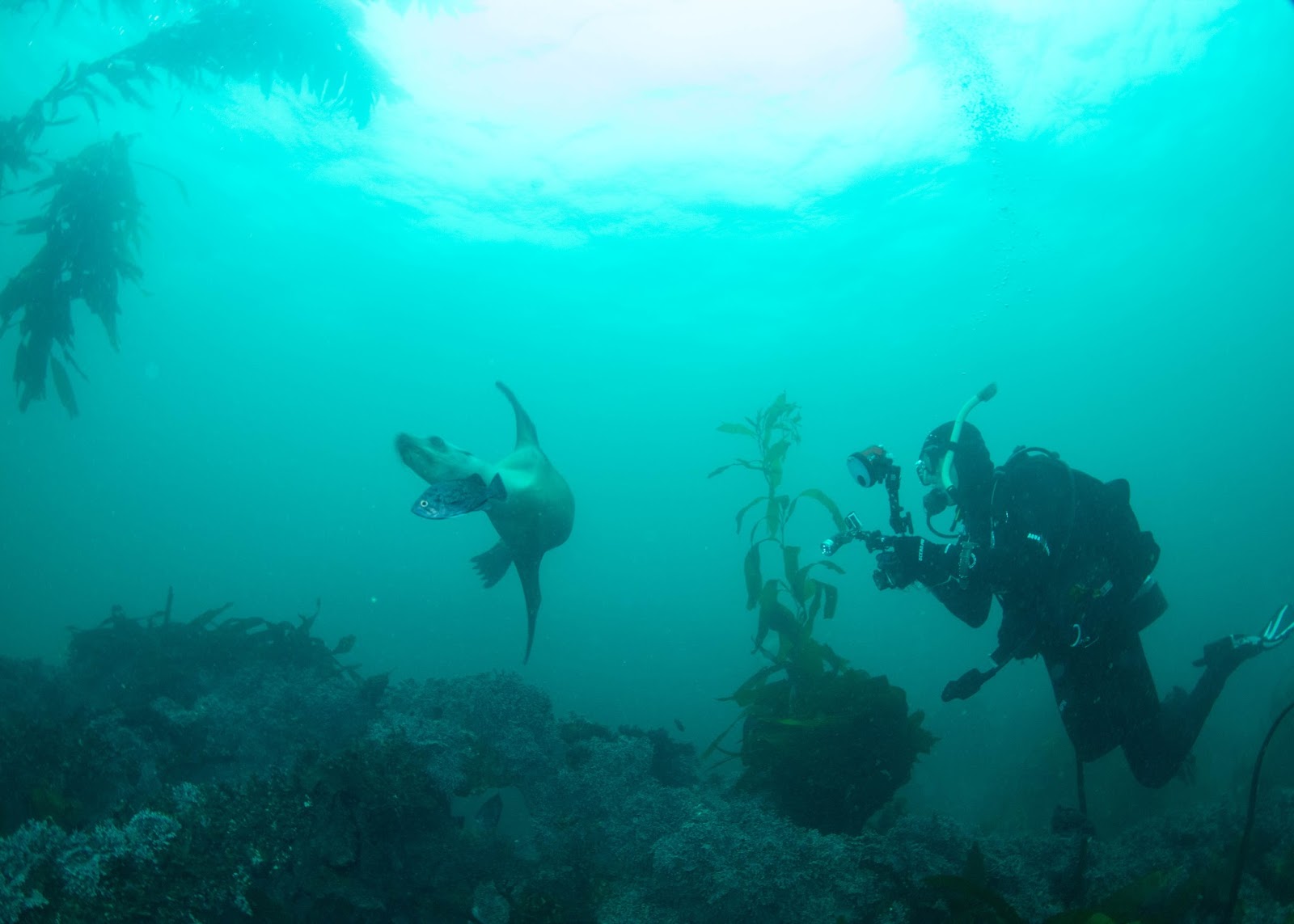 Greg with a a sea lion and another photo bombing blue rockfish.